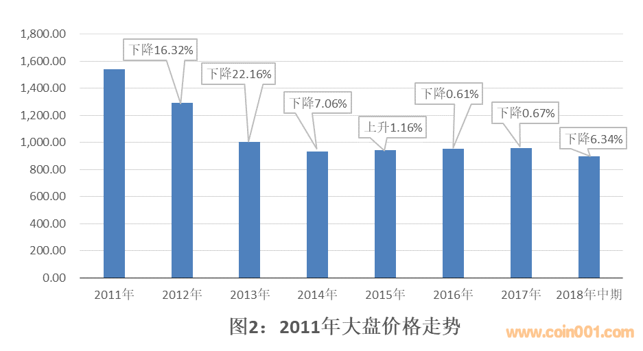 如圖2所示,在2011年大盤中,隨著2012年至2014年市場(chǎng)交易價(jià)格的連續(xù)大幅下行,2015年至2017年開(kāi)始出現(xiàn)筑底特征。但是進(jìn)入2018年后,市場(chǎng)交易價(jià)格開(kāi)始出現(xiàn)新一輪的下降走勢(shì),2018年中期與2017年相比市場(chǎng)價(jià)總值下降6.34%,與2011年市場(chǎng)價(jià)總值1542.81億元相比下降41.90%。