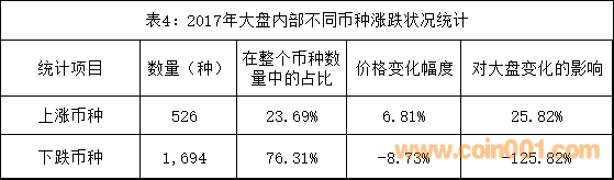 在2017年大盤市場(chǎng)價(jià)總值的下降過(guò)程中,其內(nèi)部仍然是漲跌互現(xiàn)。在2017年大盤的2220個(gè)幣種中價(jià)格變化的統(tǒng)計(jì)見(jiàn)表4。