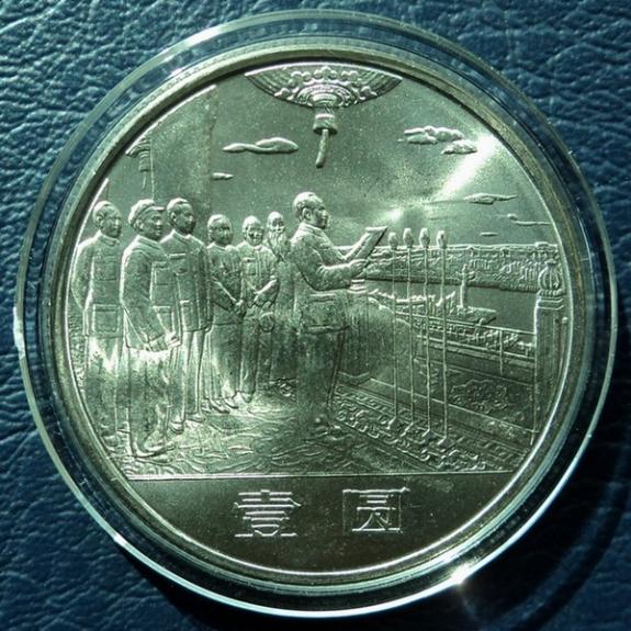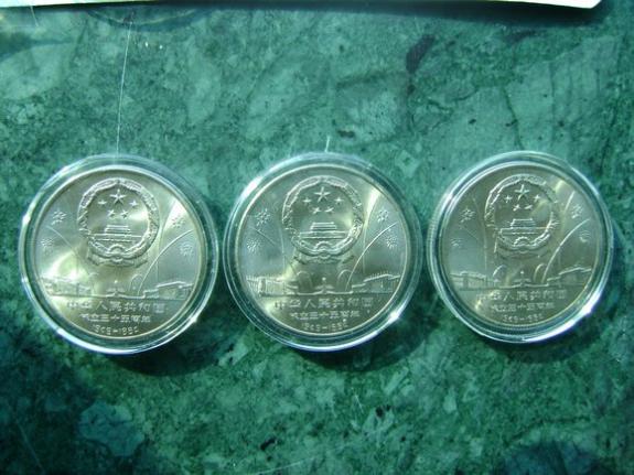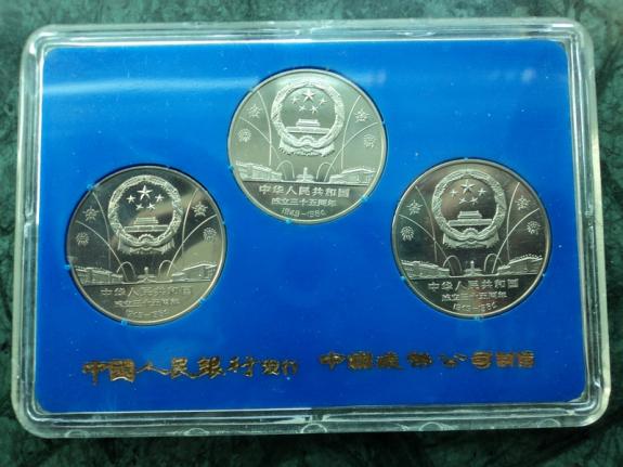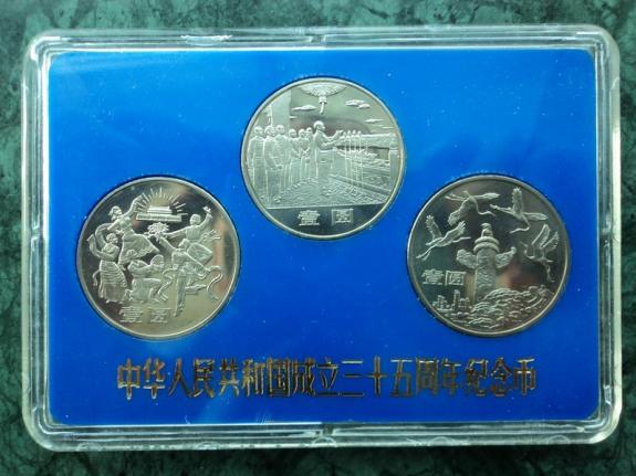 為了隆重紀念中華人民共和國成立三十五周年,經國務院批準,中國人民銀行特于1984年10月1日首次發行流通紀念幣1套3枚。幣的正面圖案相同,均為國徽、禮花和天安門廣場建筑物,下方有"中華人民共和國成立三十五周年"及"1949-1984"字樣,背面圖案分別是“開國大典”、“民族大團結”和“祖國萬歲”。面值壹圓、材質銅鎳合金、直徑30毫米、厚度1.7毫米、重量9.32克,由上海造幣廠和沈陽造幣廠分別鑄造。