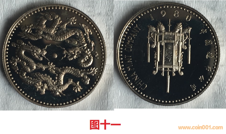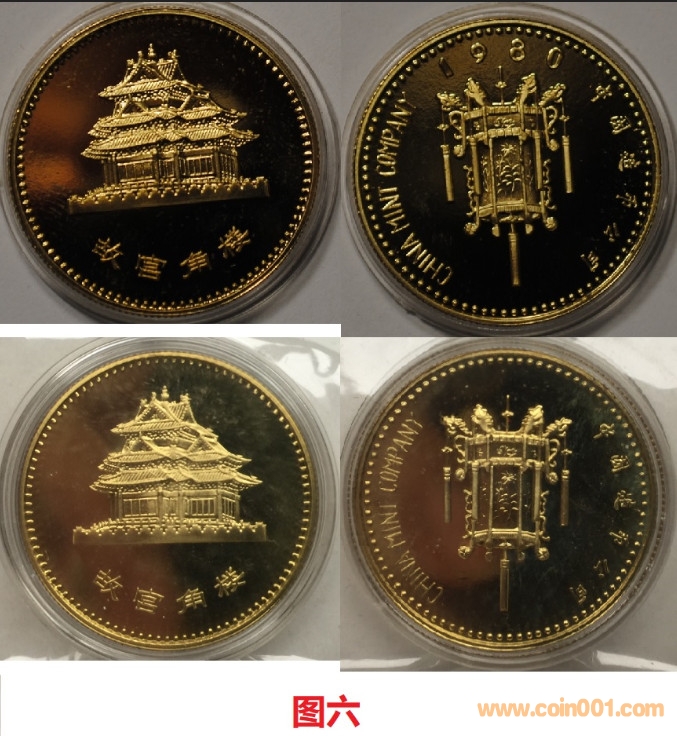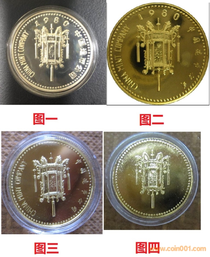 圖二,宮燈+1980年號+中國造幣公司的中英文款(字體為行書)。這種改良后的行書款字體,漂亮了很多,用作以后正式發行之用。筆者猜想,文字很有可能是做石膏模機雕上去的。可見手雕難度之大。這種帶1980年號的宮燈,從1979年開始創作,基本都很罕見。