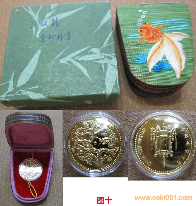 早期帶中國造幣公司款的宮燈,基本都是本銅精制的,但是也有也有鍍金的版別,這些80年代鍍金的產品,從市場所見來看,比本銅精制的還要罕見,當時鍍金也是高檔貨了。筆者偶得一枚,在繡花錦緞上寫了樣章二字,不知何意,見圖十。