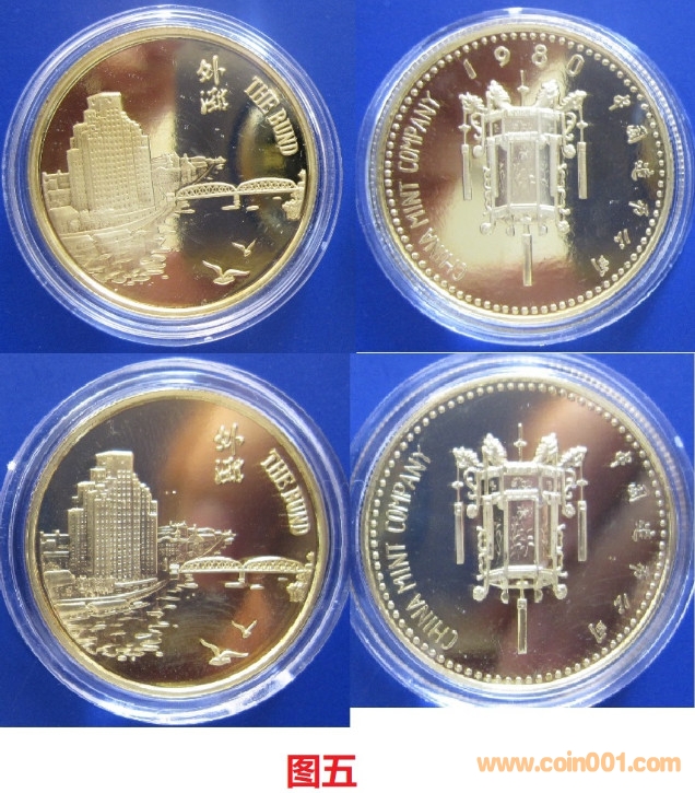外灘宮燈見圖五,正面宮燈為裔式忠手雕,反面外灘和上海風景章中的外灘圖案一樣,因為雕刻機縮小雕刻。其中帶1980年號的,到目前為止僅現一枚,十分罕見。目前只發現本銅精制的版別,沒有發現鍍金的再版。