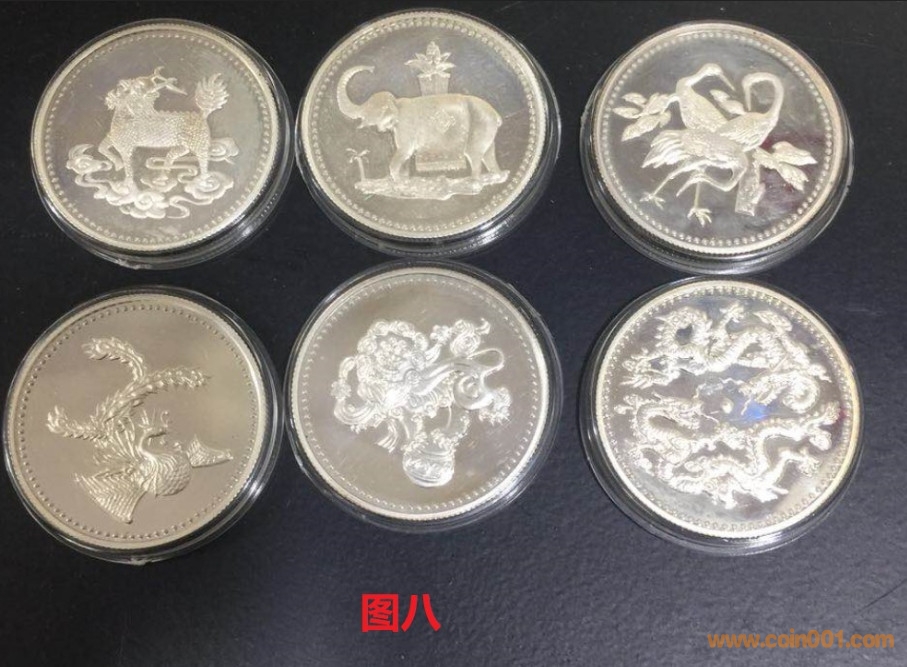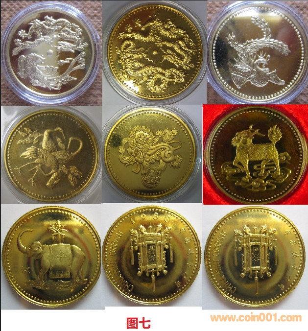 吉祥如意宮燈,見圖七,此套吉祥如意集中了上幣眾多的手雕大師,正面宮燈也為裔式忠手雕。反面龍鳳、雙龍為葉仲華手雕;單鳳為龔宜亭手雕;仙鶴為裔式忠手雕;獅子、麒麟為方茂森手雕;大象為葉柏林手雕。均有帶1980年號的和不帶1980年號的,其中帶1980年號的,十分罕見。造幣廠有一位手雕大師認為,吉祥如意應為6枚一套,其中龍鳳章,龍鳳這一面最邊上沒有圓點,而且創作的時候也是獨立進行,只是題材和其他六枚類似,故容易劃為一類。這個觀點有點道理,早期上幣純銀(白銅)宮燈就是6枚一套,其中沒有龍鳳,見圖八;后期90年代都有鍍金再版(宮燈面無年號、無款),也是6枚一套,其中也沒有龍鳳,見圖九,不知是巧合還是有意為之。