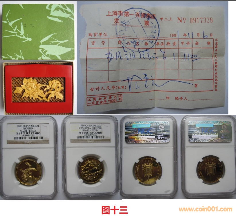 宮燈系列,吉祥寓意,深受中國藏家的喜好,基本都為手雕作品,十分精美。早期是作為高級藝術品銷售。筆者偶爾購得兩枚一套的宮燈,里面還有一張上海第一百貨公司的發 票,第一百貨公司是上幣特約經理部成立之前的四大經銷店之一,這兩枚帶1980年號的本銅精制宮燈,在1981年盡然賣到了11元,見圖十三。按照當時的工資,國人難有實力購買,所以很多宮燈系列,都銷往海外,尤其是帶1980年號的,國內十分罕見,國外反而常見,已屬收藏投資的佳品。