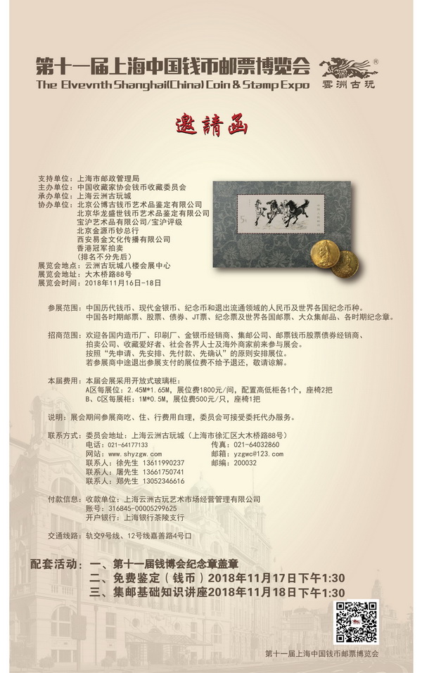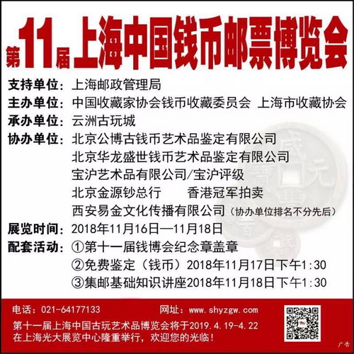 由上海市郵政管理局為支持單位,中國收藏家協(xié)會錢幣收藏委員會主辦,北京公博古錢幣藝術(shù)品鑒定有限公司、北京華龍盛世錢幣藝術(shù)品鑒定有限公司、寶滬藝術(shù)品有限公司/寶滬評級、北京金源幣鈔總行、西安易金文化傳播有限公司、香港冠軍拍賣協(xié)辦,云洲古玩城承辦的第十一屆上海中國錢幣郵票博覽會將于11月16日至18日在云洲八樓會展中心盛大開幕。