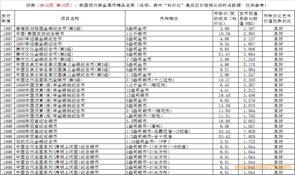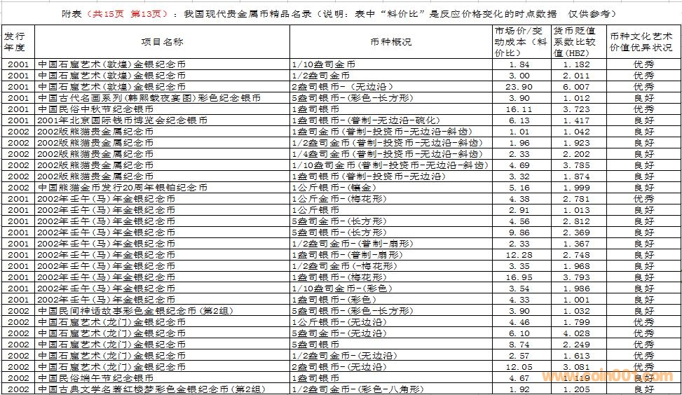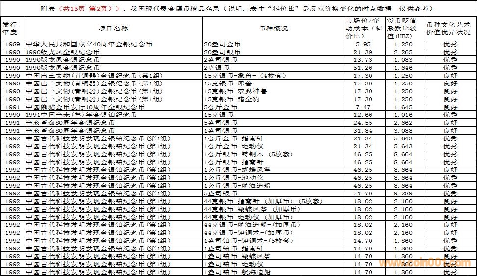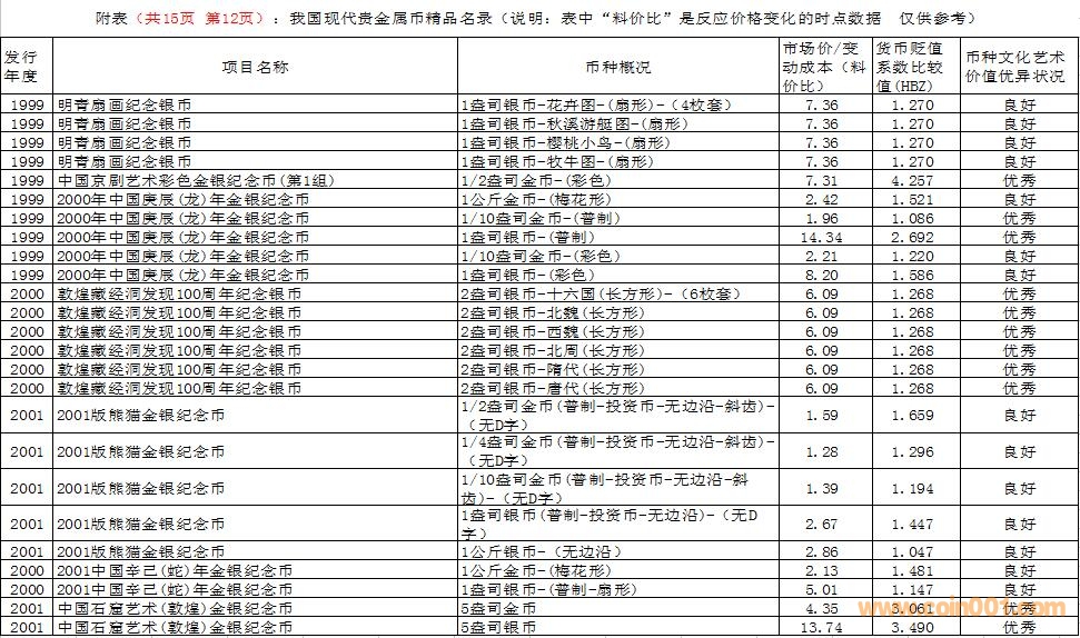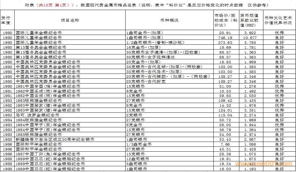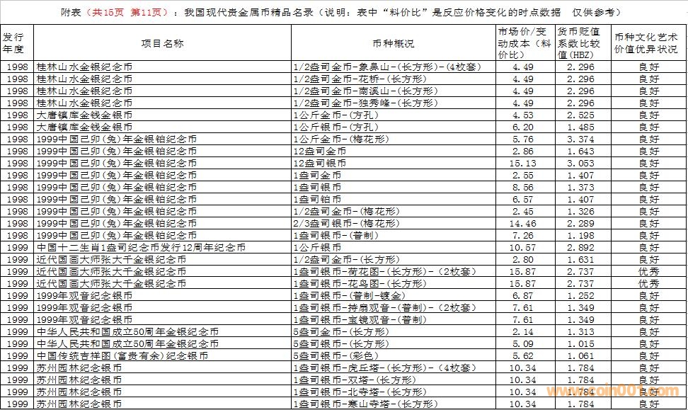 在這里需要特別說明的是,由于幣種的文化藝術(shù)價值和投資價值都是動態(tài)的。特別是由于受到市場交易價格和貨幣貶值速度等多種因素的共同影響,投資價值的變化規(guī)律比較復(fù)雜,具有不確定性。人們不能用過去的投資價值代替現(xiàn)在的投資價值,也不能用現(xiàn)在的投資價值反推今后的投資價值。因此附表中展示的幣種僅僅反應(yīng)目前的狀況,雖然具有一定的參考價值,但今后不同幣種的變化方向值得密切關(guān)注。
