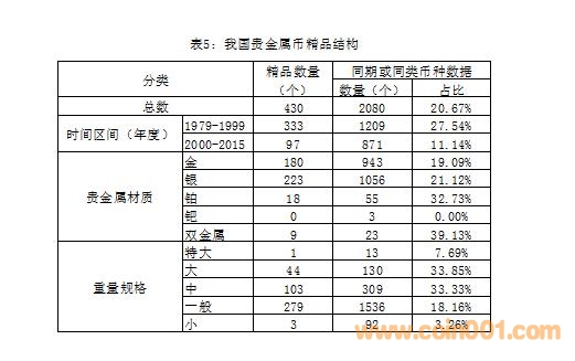 根據(jù)精品的基本概念和評價的具體標(biāo)準(zhǔn),我國貴金屬幣的精品結(jié)構(gòu)見表5,這些幣種的名錄見附表。