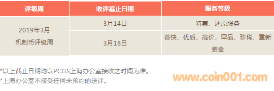 (中國(guó),上海)- PCGS上海辦公室2019年3月機(jī)制幣評(píng)級(jí)周活動(dòng)將于即日起開(kāi)始接受送評(píng),請(qǐng)各位會(huì)員根據(jù)評(píng)級(jí)時(shí)間做出安排,預(yù)約送評(píng)!