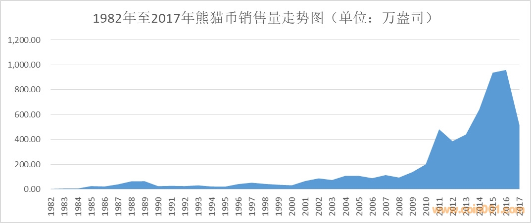 市場(chǎng)規(guī)模:我國(guó)熊貓幣1982年的銷售規(guī)模為4萬(wàn)盎司,在此之后呈現(xiàn)波浪式發(fā)展態(tài)勢(shì),到2017年底已經(jīng)實(shí)現(xiàn)年度銷售規(guī)模515.17萬(wàn)盎司,成為我國(guó)現(xiàn)代貴金屬幣的重要支點(diǎn)和最重要的組成部分。
