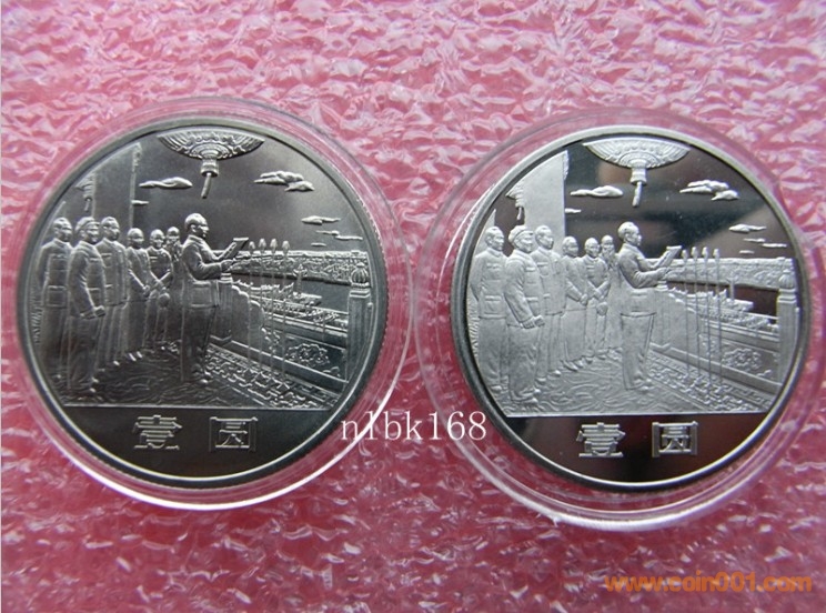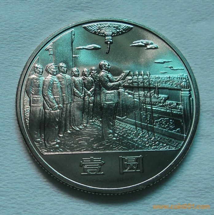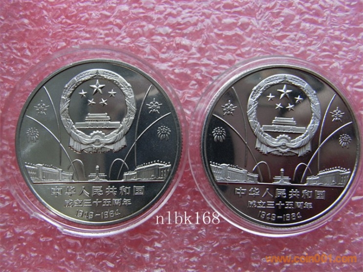 我國第一套流通(普通)紀念幣的研發時間是1984年上半年開始,這套普通紀念幣的主題是“慶祝中華人民共和國成立35周年”,年號為“1984”,一套三枚:正面圖案為“國徽、天安門廣場”;背面圖案主題分別為“祖國萬歲”、“民族大團結”和“開國大典”。其主要技術參數為:材質(B25鎳白銅);直徑(Ф30mm);邊厚(1.80 mm);單枚質量(9.32g)。該套幣由上海造幣廠和沈陽造幣廠同時生產,上海造幣廠於1984年5月向總公司報樣,當時樣幣的邊厚(1.75 mm);單枚質量(9.2g)。后根據總公司的要求調整為單枚質量(9.4g)。
