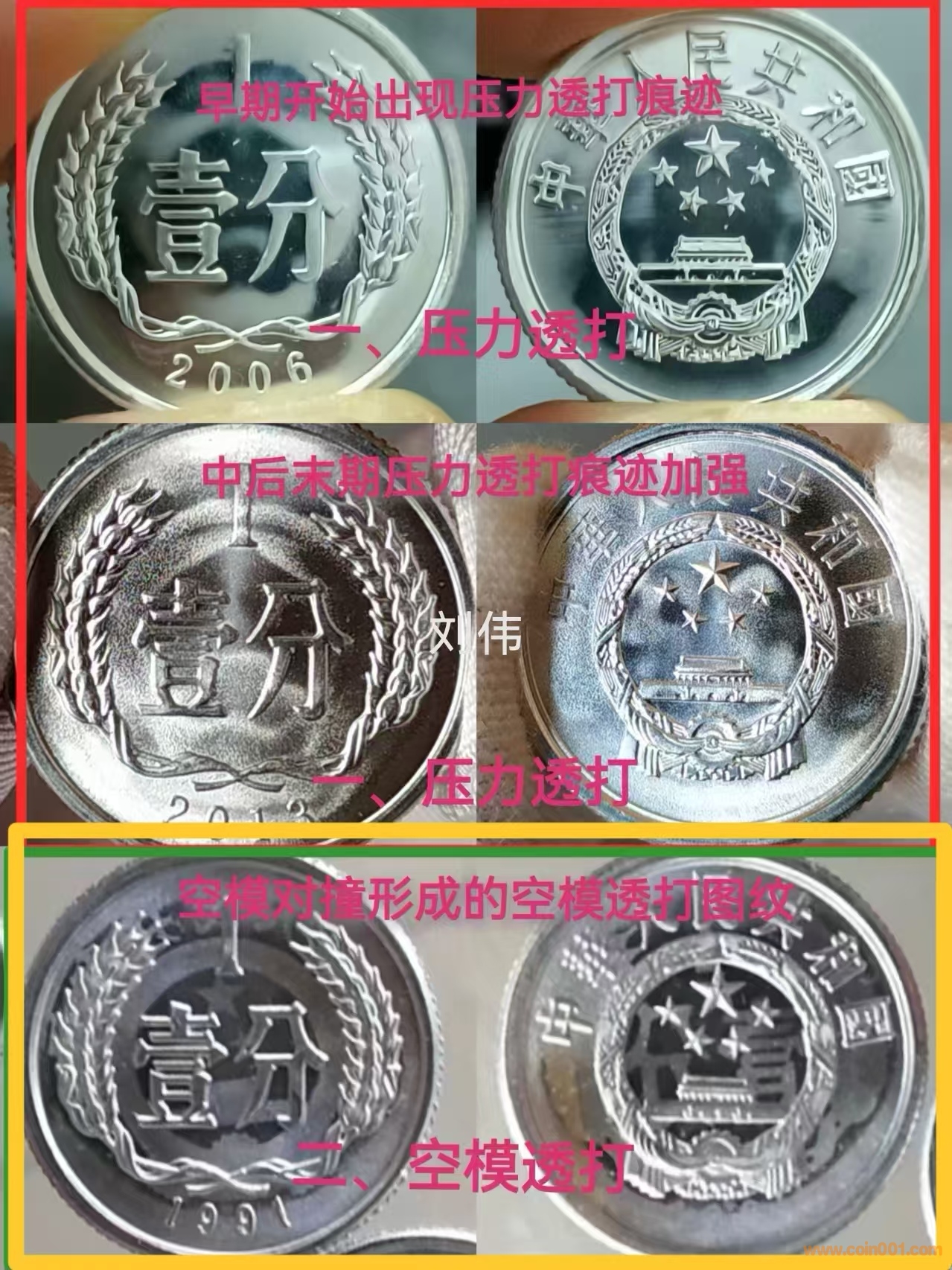 模具壓印幣坯,在高壓下,幣坯迅速向四周壓延,在模具狀態(tài)好的時(shí)候,延展產(chǎn)生的摩擦力相對較小,延展順利,圖文塑形完美完成;隨著壓印進(jìn)展,磨具隨著幣坯壓延磨損,表面光滑度降低,摩擦力變大,容易產(chǎn)生鑄紋,并且?guī)排鬟呇夭糠謮貉游灰谱畲螅p也最明顯,最先出現(xiàn)細(xì)微的磨損鑄紋,呈現(xiàn)白霧狀;隨著壓印繼續(xù),磨損繼續(xù)加大,鑄紋更加明顯,出現(xiàn)明顯一圈的透打白亮痕跡,同時(shí)反向圖文透打痕跡也越來越明顯,因此這種反向模糊圖文叫“壓力透打”。總之,就是金屬快速流動痕跡和流動對模具摩擦力變大導(dǎo)致模具表面平整光滑度降低,共同作用形成的開始白霧,后來嚴(yán)重的透打痕跡。
