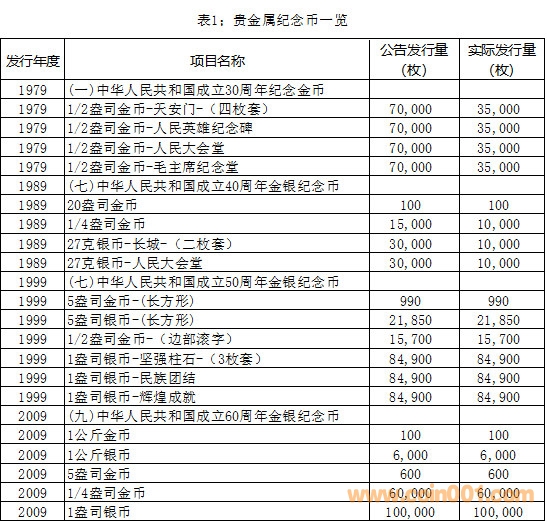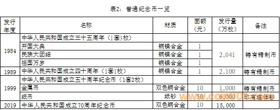 ????????央行發行以慶祝中華人民共和國成立為主題的紀念幣(以下簡稱“建國幣”)是從1979年9月3日開始的,這也是新中國首套貴金屬紀念幣和“建國幣”的誕生日。1979年到2019年,我國央行發行的“建國幣”可以分為貴金屬紀念幣和普通紀念幣兩大類。其中在普通紀念幣中又包括金屬幣和紙幣兩個子類。在1984年、1989年和1999年發行的普通紀念幣金屬幣的每個幣種中還同時鑄有少量精制幣。在紙幣中還特別印有少量聯體鈔。這些“建國幣”的統計匯總見表1和表2。