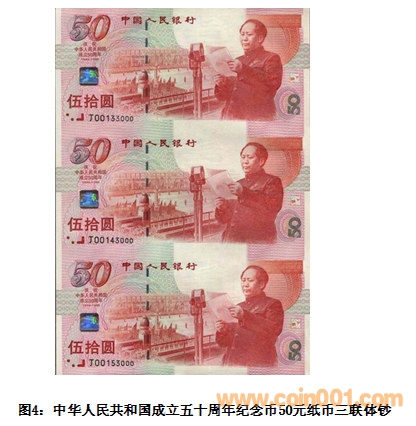 ????????紙幣的基本功能是滿足貨幣流通,因此以單張形式存在是理所當然的。但是紙幣還有收藏鑒賞功能,為了滿足這種文化需要,在國外的某些國家中發行連體紙幣已經成為一種慣例。對于我國來講,到1999年時發行連體紙幣還是空白。令人欣喜的是,填補這個空白的機會又留給了“中華人民共和國成立五十周年紀念幣”的50元紀念紙幣。在此之后我國陸續發行了多種人民幣紙幣的連體鈔,豐富和滿足民眾的收藏鑒賞需求。但是人們不應忘記,是“中華人民共和國成立五十周年紀念幣”50元紙幣的連體鈔開創了我國發行連體紙幣的先河,實現了紙幣形態的創新。