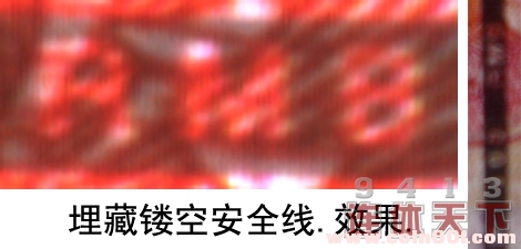 大家可以通過以上圖 1 那是一張造紙廠造出來還未印刷過的紙張.透過光能看到一些埋上去的小葉片紙紋這就是埋紙技術.再從圖2看無透過光又是一張夾著全息開窗安全線的白面平紙.也就可以說埋紙是一道很大的防偽了.希望以后能(燙印式)和.(埋紙)二不缺一的做得更完美更平整.以下還要給大家介紹一個目前我們國內采用上的(燙印式)全息網點鏤空防偽.請看下圖。