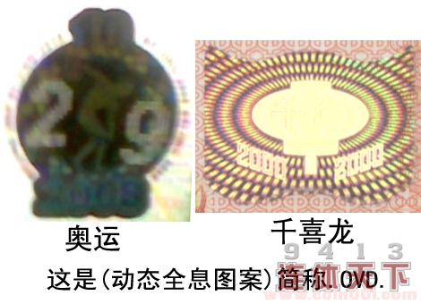 圖上有兩個防偽標志.1北京奧運.2千喜龍鈔.這是(動態全息防偽)簡稱OVD.在2000年的時候采用的是整個標志燙印上.而在2008年就采用了陰陽燙.大家可以從標志內看到了兩個數字29.那就是網點鏤空燙印.也稱陰燙印.位于標志外圈有一圈細小文字.這就稱陽燙印.總稱鏤空OVD防偽。