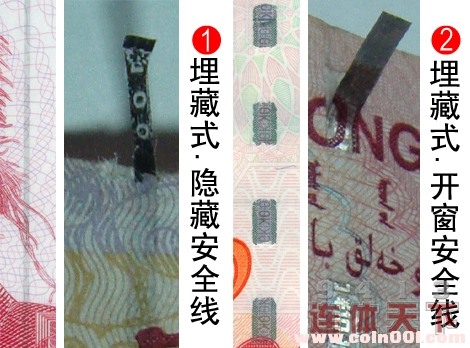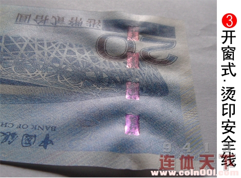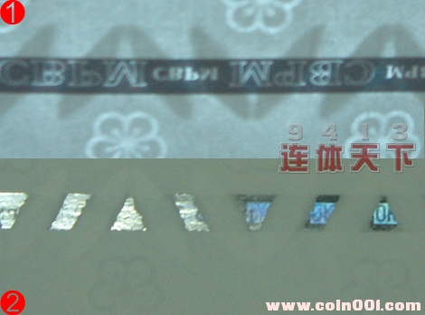 以上就是第五套人民幣1999版上的(全埋式)鏤空安全線.他的鏤空字體看上去感覺就沒有(燙印式)鏤空安全線的效果了.也可以說技術在改進.畢竟時間已過了十幾年了.可大家看到以上一些(燙印式)全亮.和.(燙印式)開窗.一定會想到為什么不采用(燙印式)來燙一節.斷一節.這樣不就不皺又有開窗和好的鏤空效果了嗎.筆者也想到這一點可在國外很多鈔票上也多采用了正面(燙印式)全亮安全線.而背面還是依然采用上了(燙印式)開窗安全線.照樣是采用埋紙.而有的國家是已有采用了斷節燙印開窗了.可是大家別忘了一件事.那就是(埋紙)也是一道很大的防偽.請大家再來看下圖片。