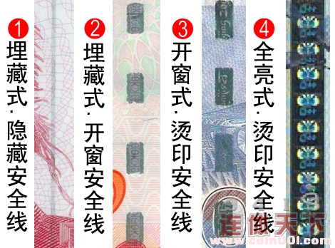 埋入安全線(和)燙印安全線防偽.以下我們先來看 4 種不同防偽的安全線的圖片。