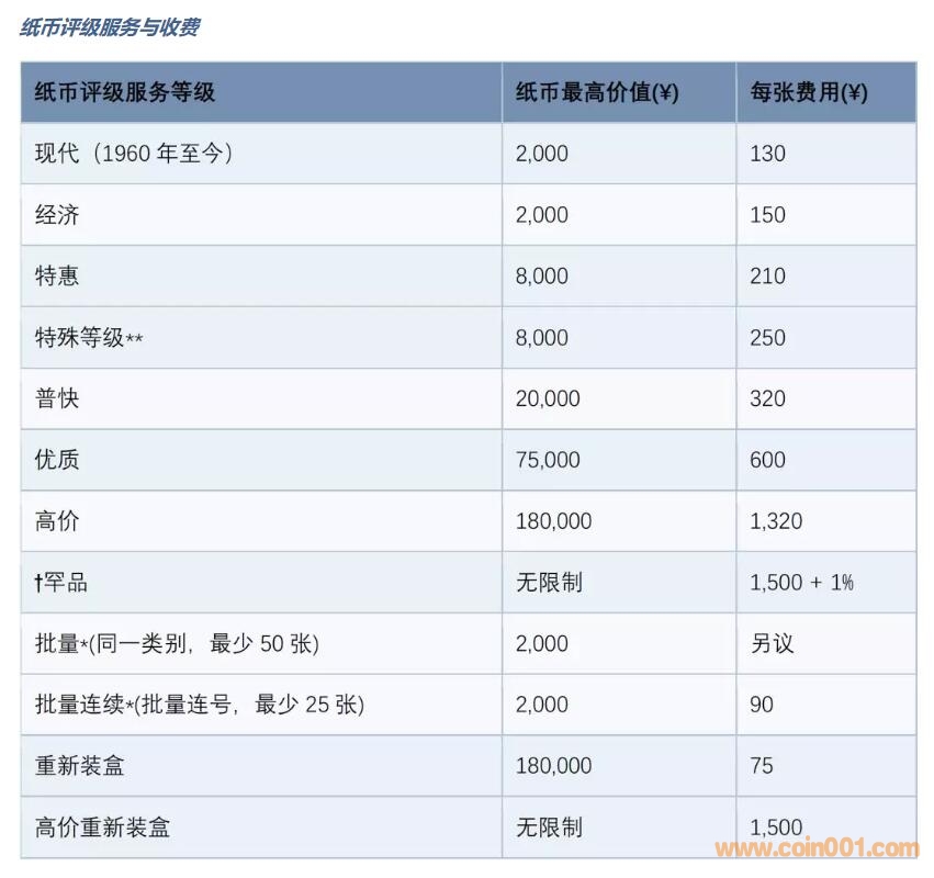 ?紙幣送評(píng)服務(wù)價(jià)格和美國(guó)同步,原本的稀有服務(wù)等級(jí)由罕品服務(wù)等級(jí)替代,新增了特殊等級(jí)、批量連續(xù)和高價(jià)重新裝盒服務(wù)等級(jí),所有服務(wù)等級(jí)的價(jià)格均做出相應(yīng)調(diào)整。