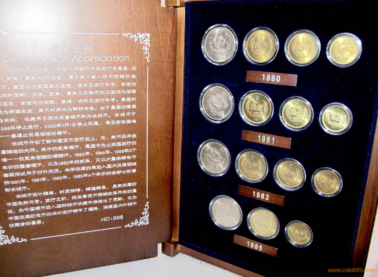 一、NGC多幣封裝(大盒) 1、NGC MS66分、67分1981年套幣(全部為81封簽初鑄幣); 2、NGC MS67分1983年套幣; 3、NGC MS66分、MS67分1985年套幣(四枚裝) 二、NGC單幣封裝 1、NGC MS67分1981年套幣(全部為81封簽初鑄幣); 2、NGC MS67分1983年套幣; 三、高檔木制禮盒裝《普制長城幣大全》 四、高檔禮盒裝單套《長城幣》 1、1980年套幣 2、1981年套幣 3、1983年套幣 4、1985年套幣 因品種不同、品相不同,價格也有不同。因品種較多,且本帖為宣傳帖,每個品種象征性標價1000元,以售帖標價為準!另外,因部分品種存量較少,收集難度較大,數量僅為1-2套。