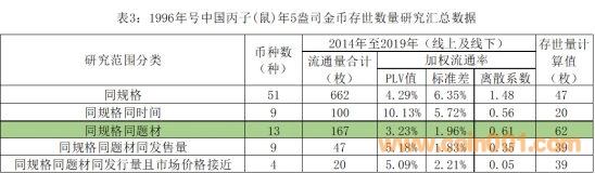 “1996中國丙子(鼠)年5盎司金幣”的流通率為2.02%。根據本研究確定的審慎原則,按照這枚幣不同分類形成的最低PLV值3.23%計算,它的存世數量似乎僅有60枚左右,那么與實際銷售數量相差的39枚是否屬于民間滅失數量得深入探究。
