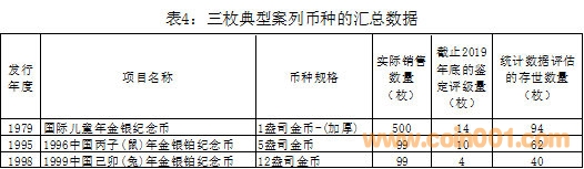 如表4所示,經過使用統計方法初步評估的“國際兒童年1盎司加厚金幣”“1996中國丙丁(鼠)年5盎司金幣”和“1999中國己卯(兔)年12盎司金幣”的存世數量大約分別為94枚、62枚和40枚。截止2019年底這些幣種的鑒定評級數量均較大幅度小于相應幣種的評估存世數量。