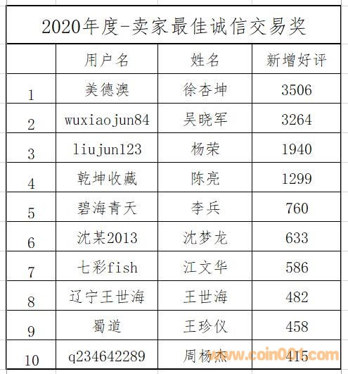 牛年伊始,為持續弘揚誠信精神,營造風清氣正的網站交易氛圍,經網站版主討論,決定對2020年度最佳誠信交易會員進行獎勵。獲獎人員為買家和賣家2020年度好評最多的前十名會員,且當年好評率99.5%以上。