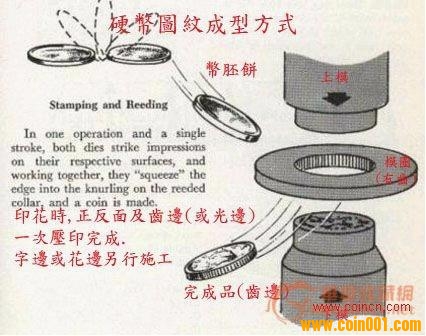 3)印花,上下鋼模中有一模圈墊套(die collar),用以保證印花時硬幣外徑尺寸統(tǒng)一;直邊齒紋,也在此同時完成(稱reeding);光邊(plain)幣同,只是模圈無直齒紋。邊齒是銀幣泉友常用鑒定重點之一,所以介紹一下,好增加些基本知識。