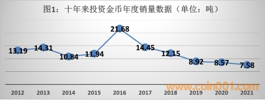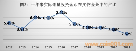 使用黃金鑄造而出的投資金幣是我國金幣市場最重要的物質基礎,也是擴容金幣市場最接地氣的黃金商品。十年來我國投資金幣的年度銷量狀況見圖1,投資金幣在實物金條銷量中的占比見圖2。