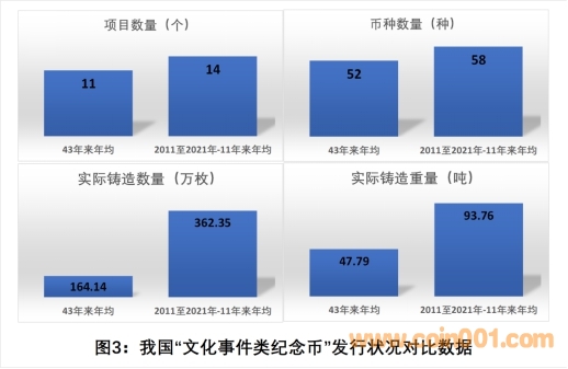 文化事件類紀念幣也是我國貴金屬幣的重要組成部分。四十三年來,我國發行的文化事件類紀念幣狀況數據見圖3和附表。