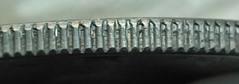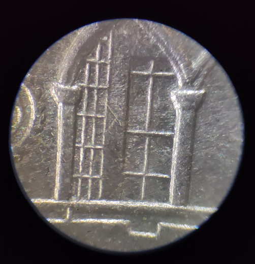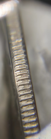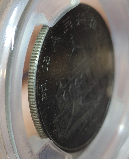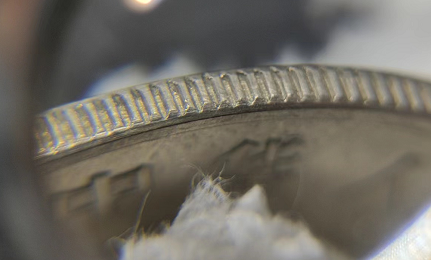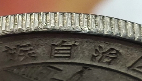 3、這枚幣的很多細節也是很多假幣難以做到的,比如較為規整的邊齒和由中間到四周的拉絲一樣的東西。