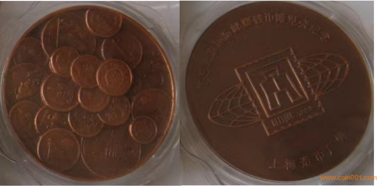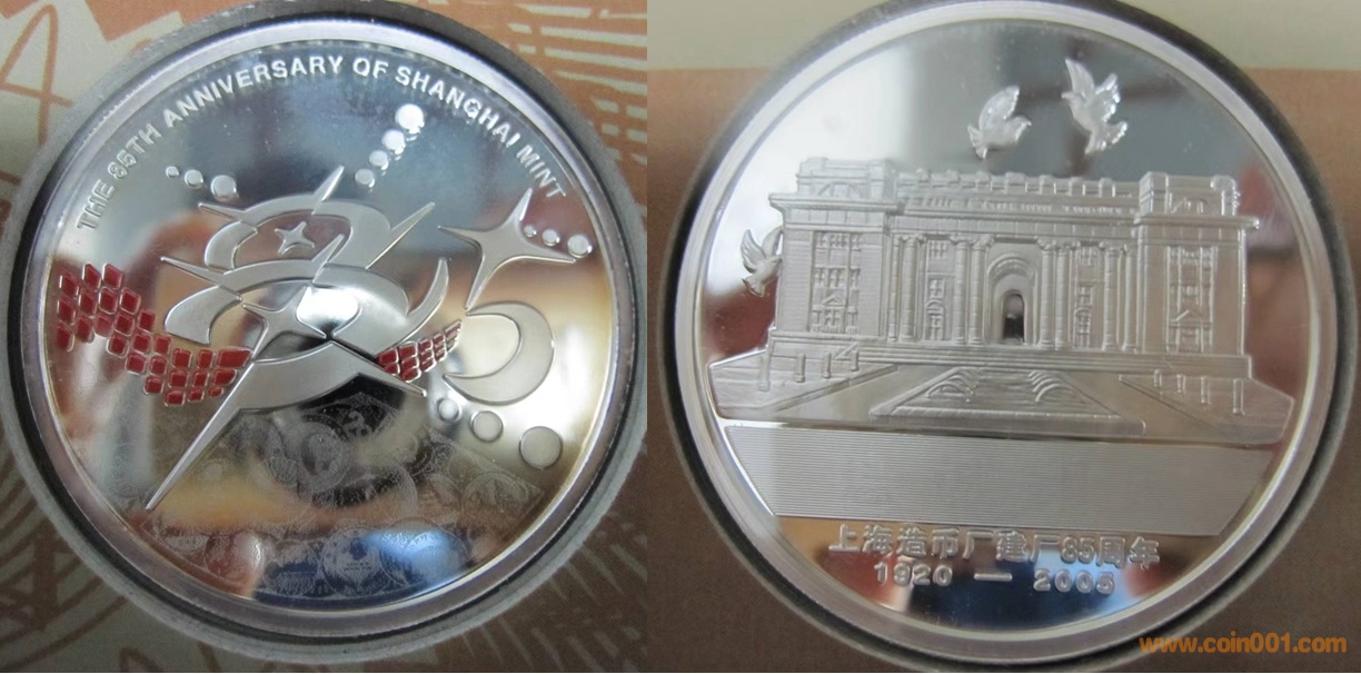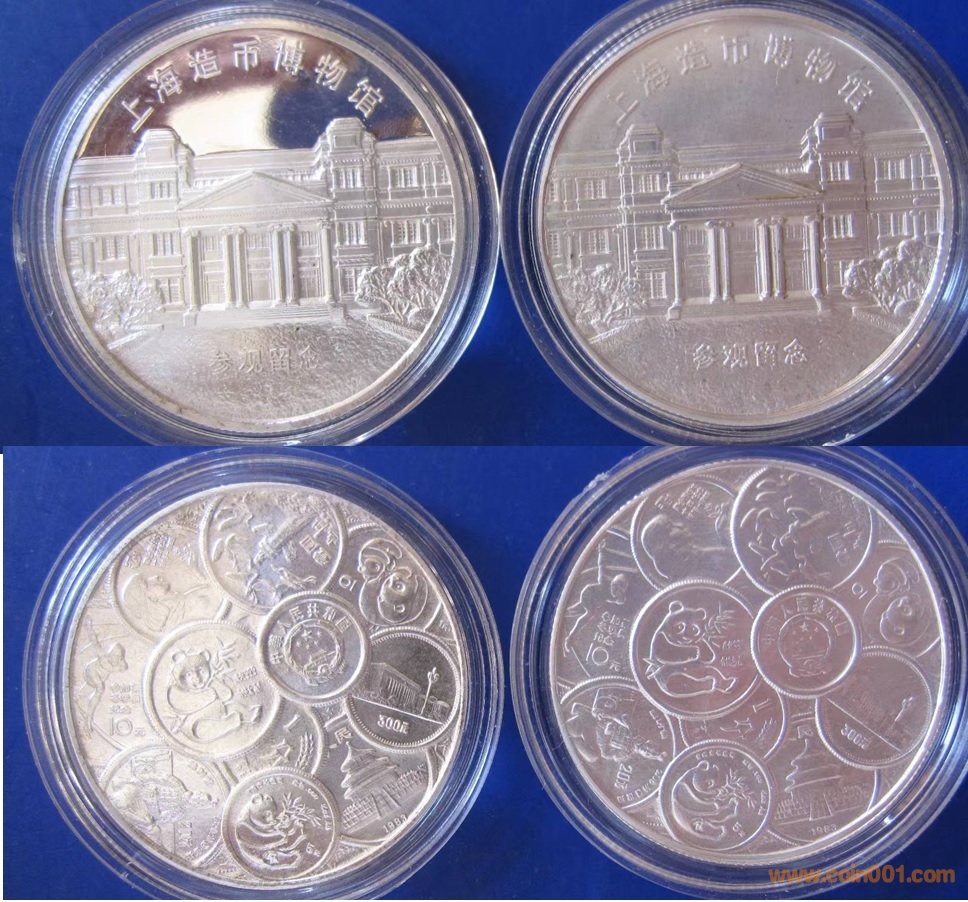 2004年制造,鍍銀30mm,上幣發行。正面為上幣原址,反面為熊貓、分幣、金銀幣天壇等疊幣圖。