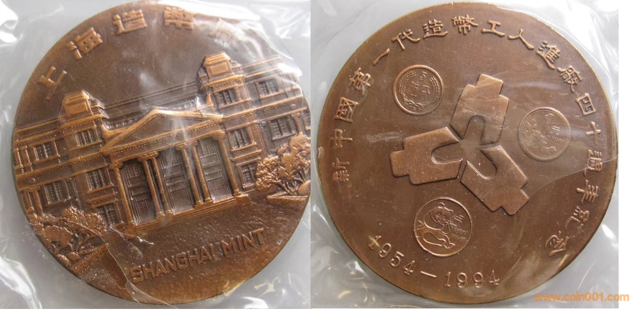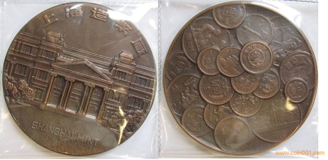 1996年制造,紫銅上色60mm,上幣發行。正面為上幣廠房,反面為長城幣、分幣、角幣等疊幣圖。