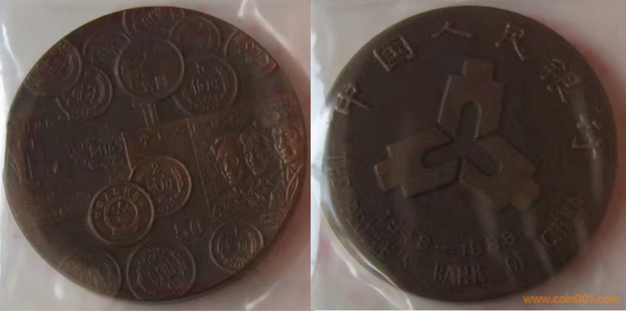1988年制造,60mm,上幣發行。正面分幣、角幣、長城幣等疊幣,反面為人民銀行標志。