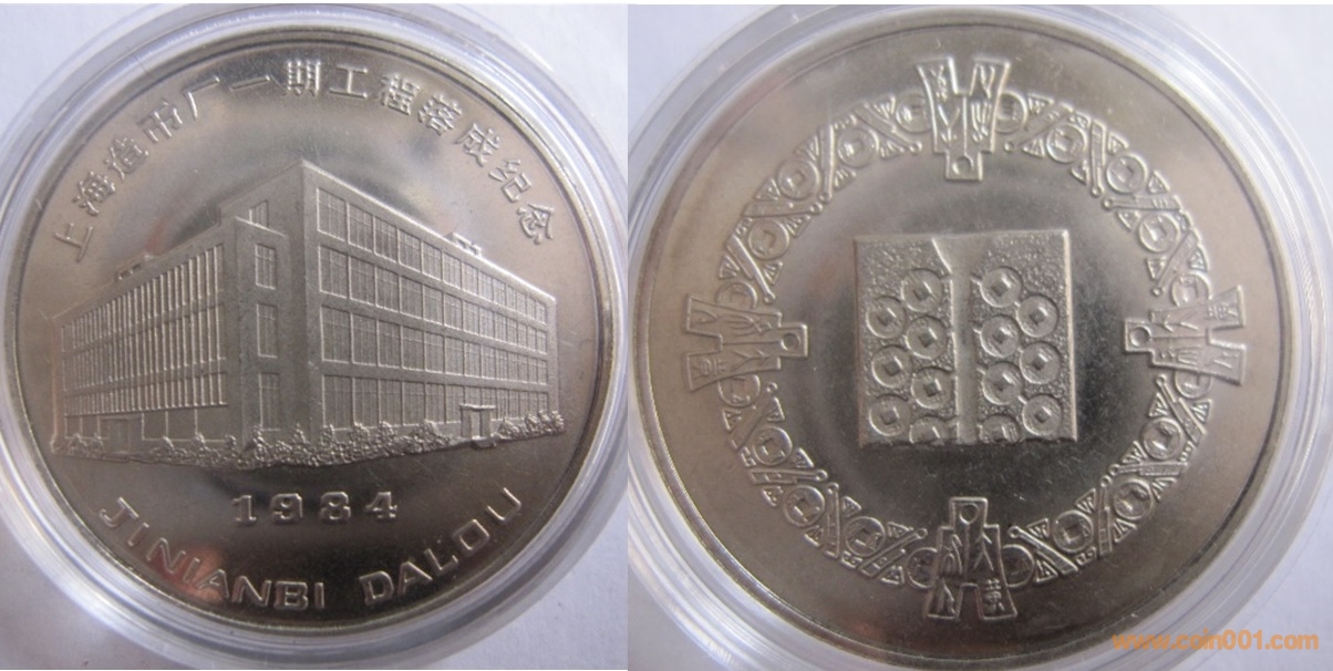 1984年制造,60mm,上幣發行。正面為上幣大樓,反面為熊貓疊幣、金銀幣疊幣、建三五疊幣以及長城幣疊幣圖。