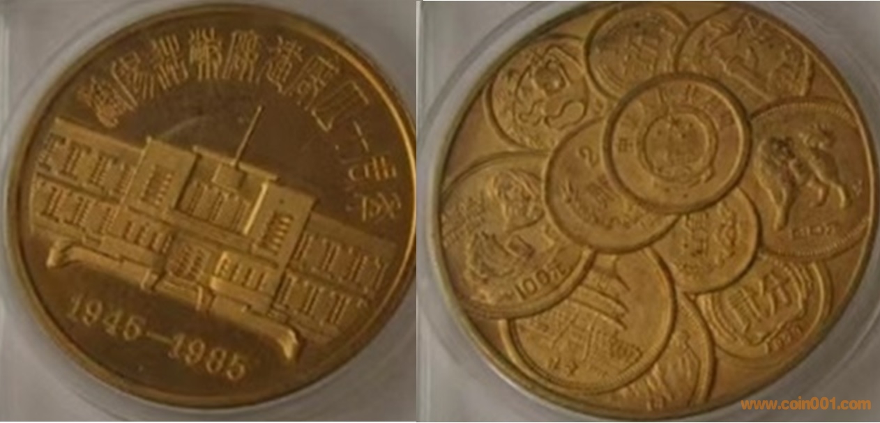 1985年制造,黃銅精制,40mm,沈幣發行。正面為沈幣大樓,反面為長城幣,金銀幣疊幣圖。