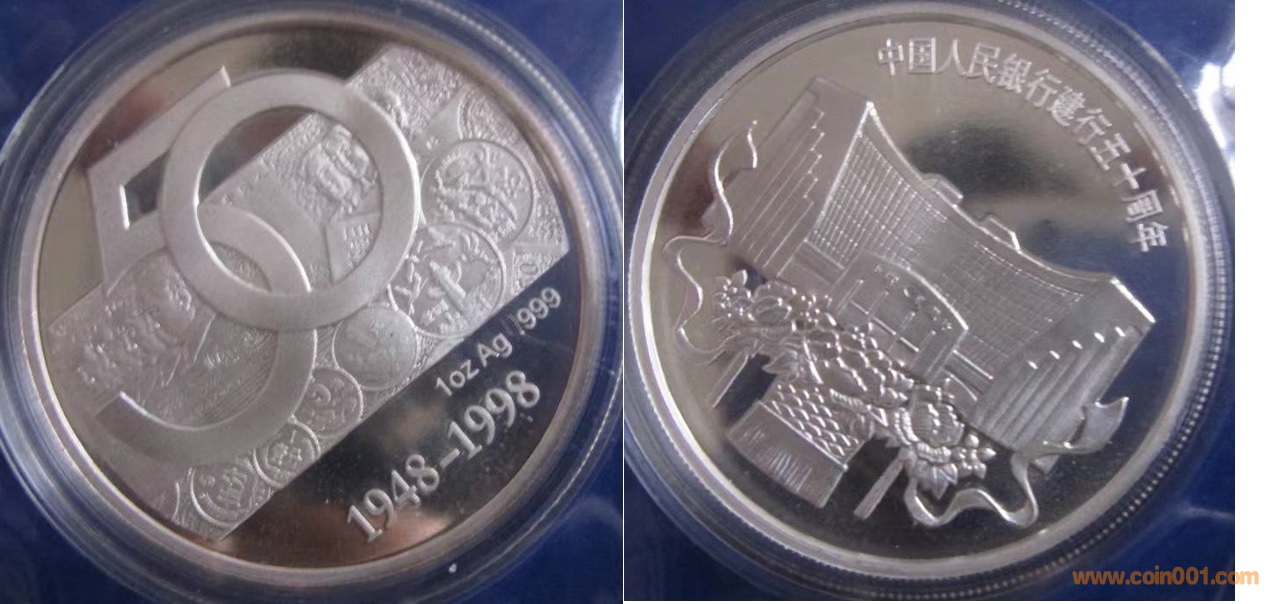 1998年制造,一盎司純銀精制40mm,沈幣發行,發行量二十萬枚。正面為紙幣、三花、建三五疊幣圖,反面為人民銀行大樓。