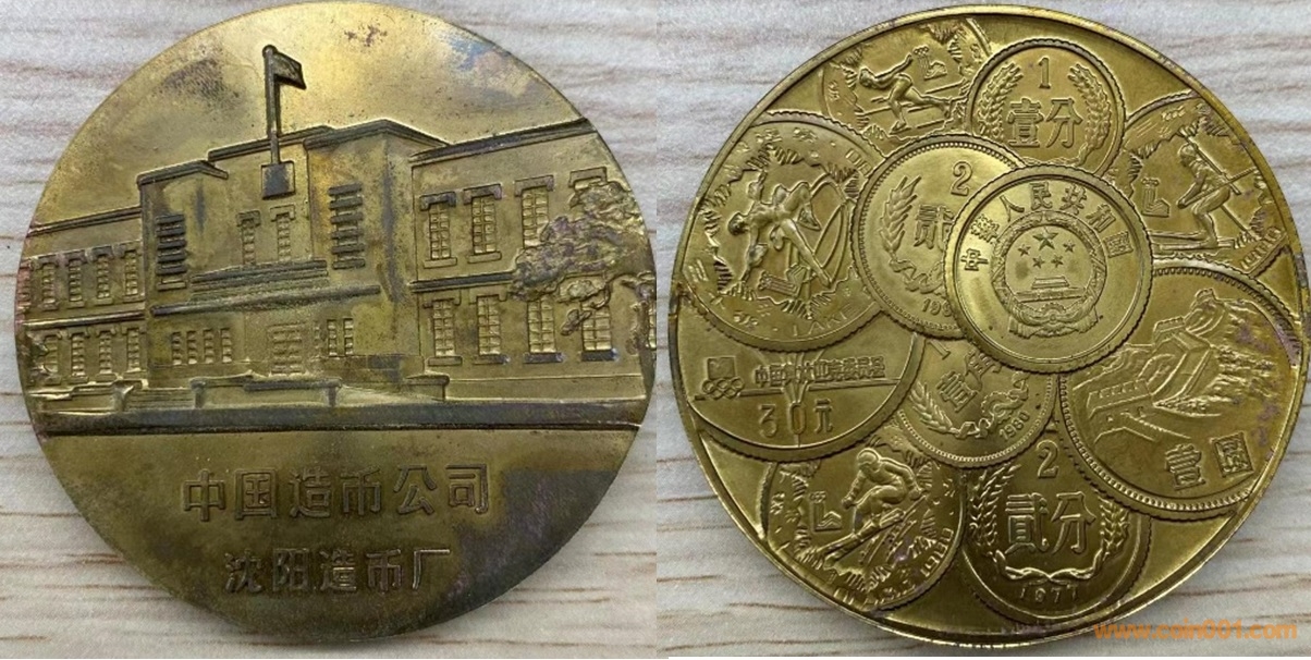 1985年制造,黃銅精制,40mm,沈幣發行。正面為沈幣廠房,反面為疊幣圖案。此章疑似有鍍金章仿品。