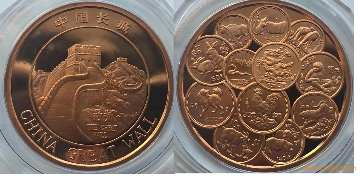 90年代制造,紫銅精制60mm上幣發行。正面為長城,反面為生肖金銀幣疊幣圖。這枚章目前為孤品。