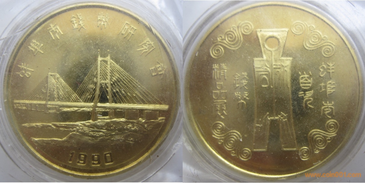 1990年制造,黃銅精制,36mm,上幣發行。正面為大橋,反面為布幣。
