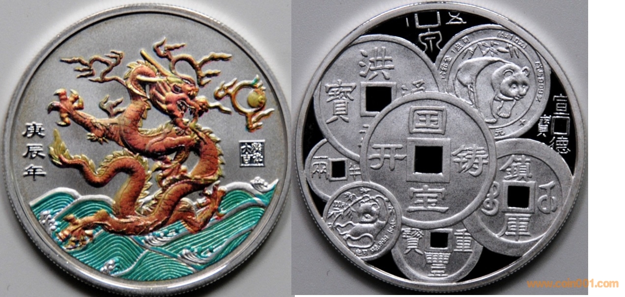 2000年制造,鍍銀鍍彩精制40mm,深圳國寶造幣公司發行。正面為祥龍出海,反面為古幣及熊貓疊幣圖。