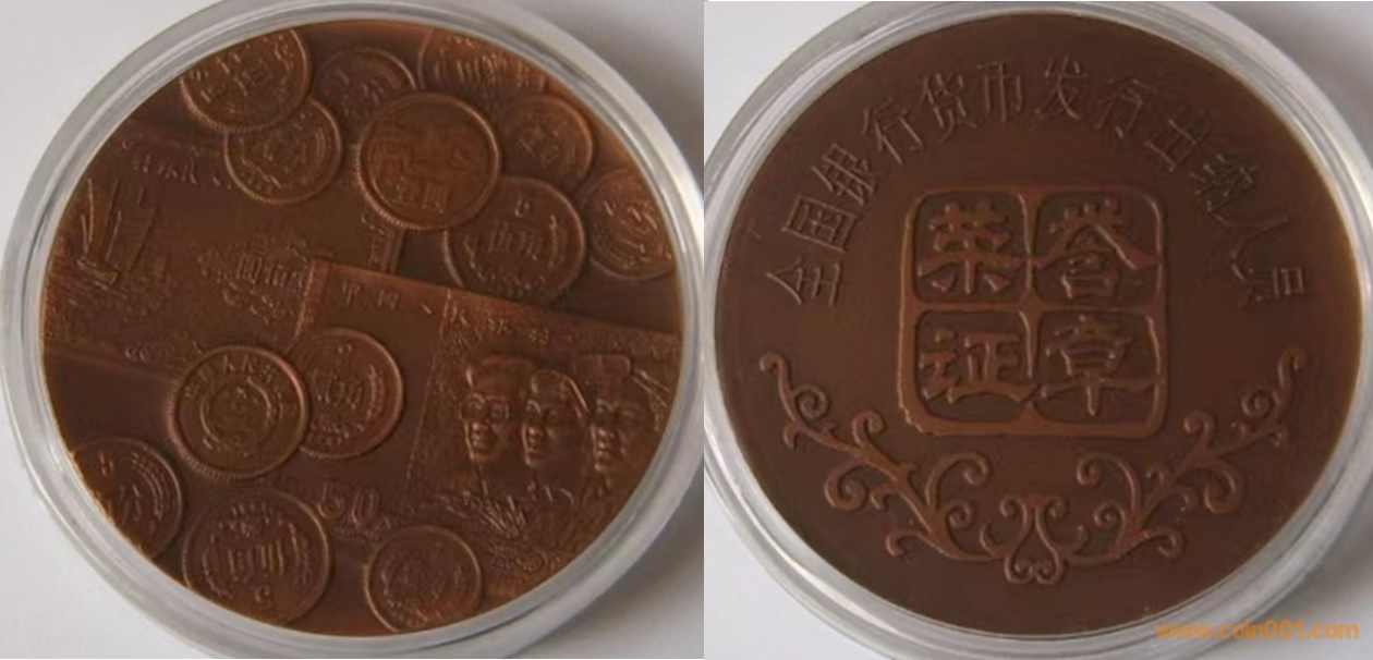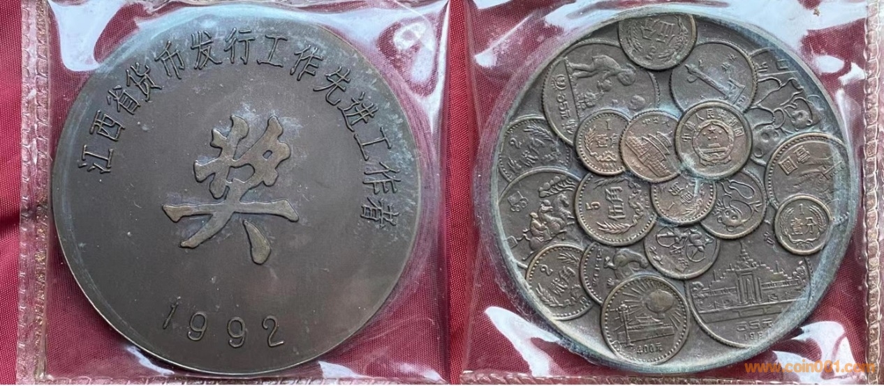 1992年制造,紫銅上色60mm,上幣發行。正面為獎字,反面為長城幣金銀幣等疊幣圖。此章為今年的新發現。