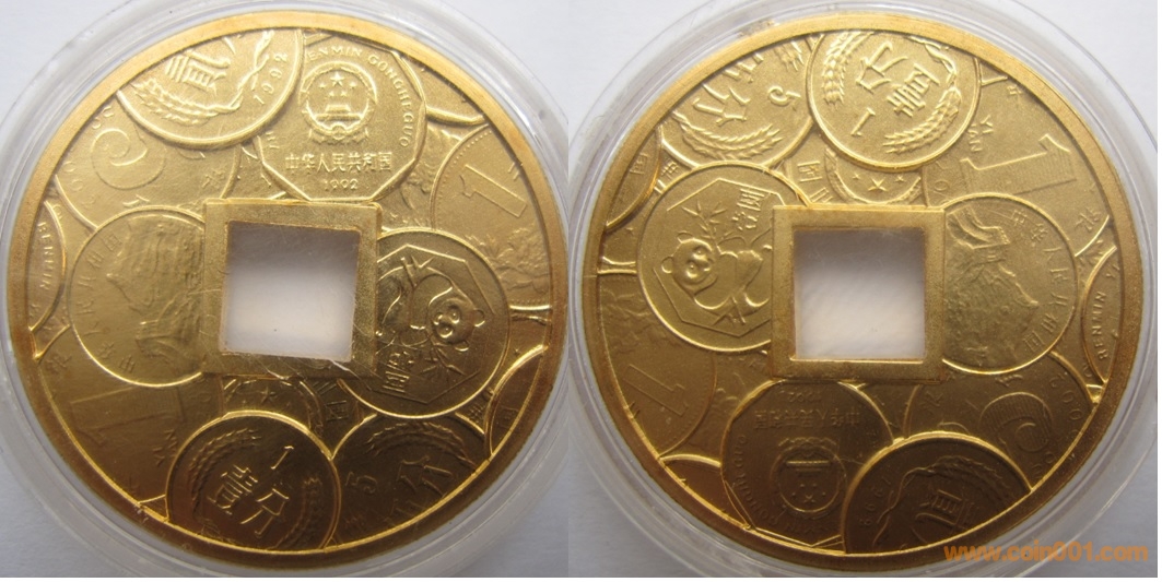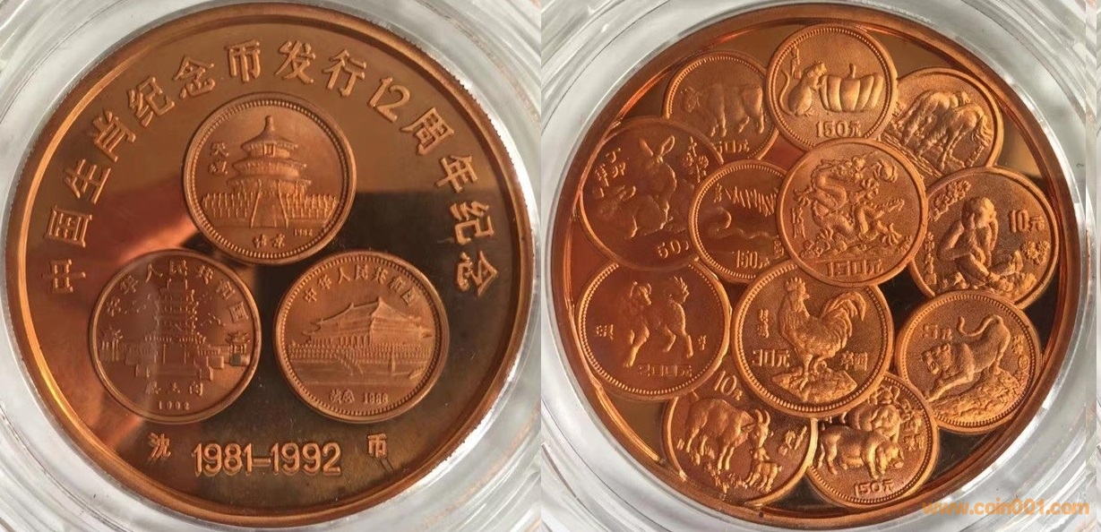 1992年制造,紫銅精制60mm,上幣發行。正面為天壇疊幣,反面為生肖金銀幣疊幣。