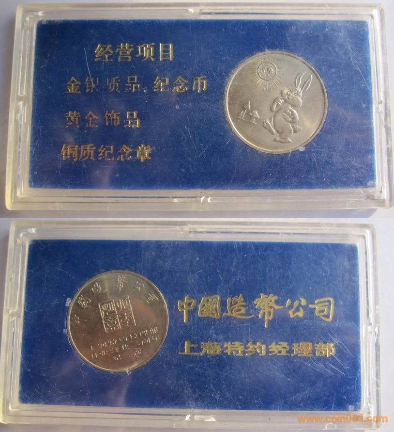 1987年制造,鋼芯鍍鎳30mm,上幣發行。正面為主題文字,反面為兔子及熊貓疊幣。