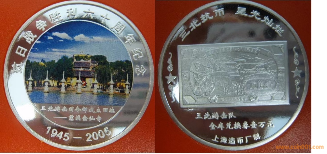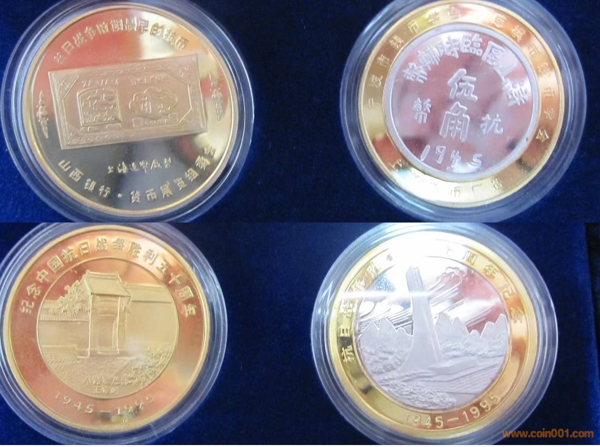 1995年制造,鍍金鍍銀40mm,上幣發行,發行量一萬二千。正面為紀念碑,反面為抗幣珍幣。