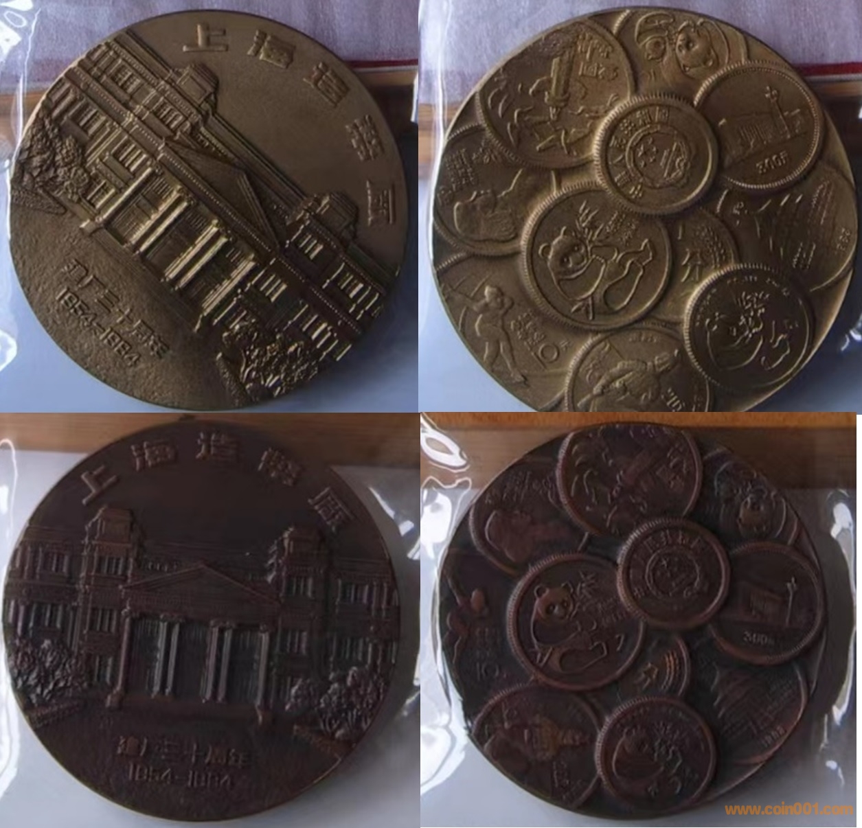 1986年制造,紫銅上色50mm,上幣發行。正面為螺旋壓桿機,反面為熊貓疊幣圖案。此章作為禮品送給各國造幣廠廠長,流出的章十分少見。