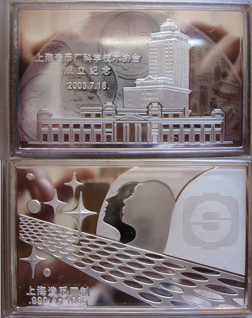 2003年制造,100克純銀隱形雕刻64mm*40mm,上幣發行,發行量500枚。正面為三花及大樓,反面為人物。