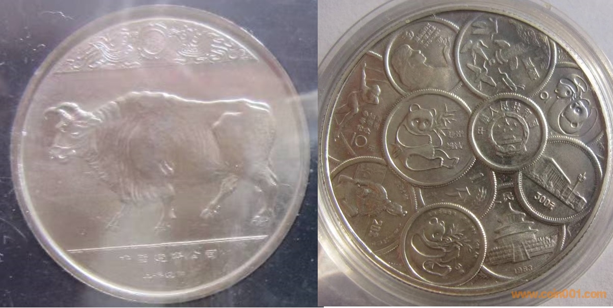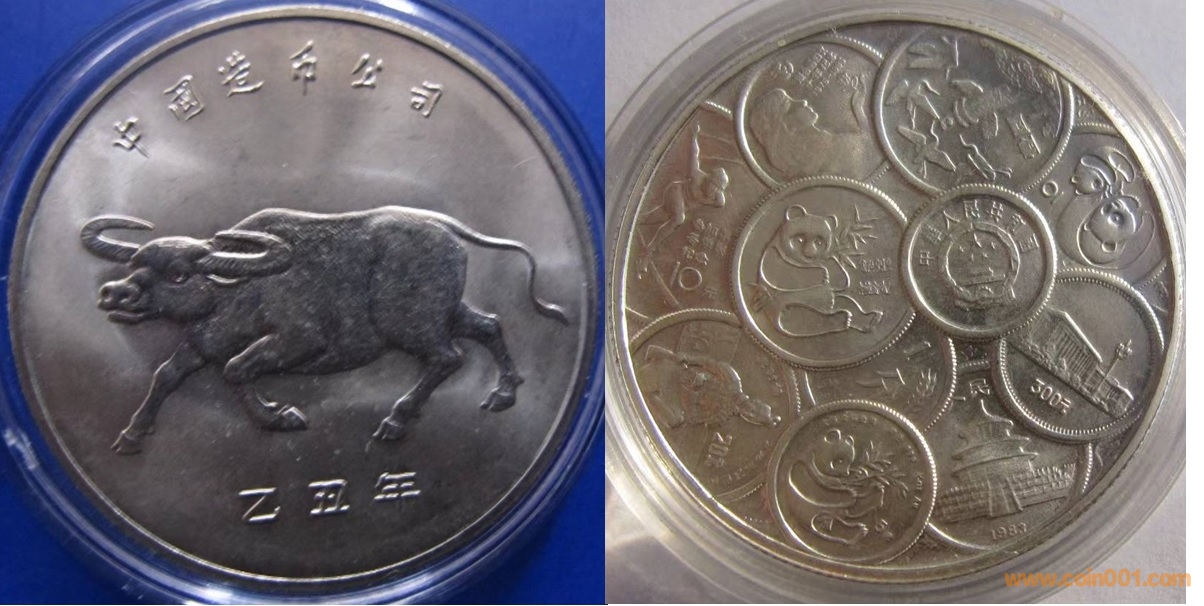 1985年制造,白銅普制,30mm。上幣發行。正面為牛,反面為熊貓、金銀幣及分幣疊幣圖。