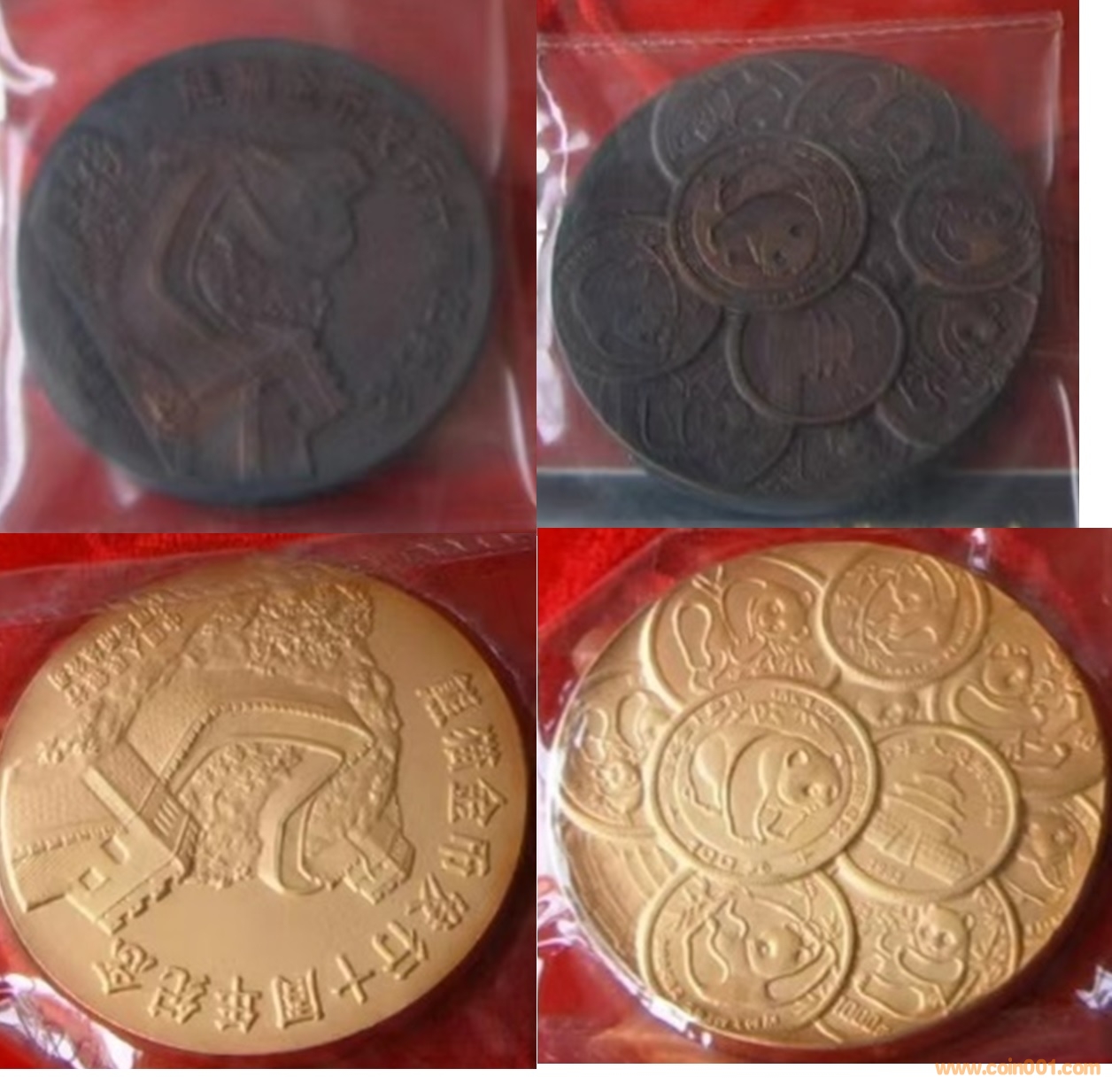 00年代制造,鍍金普制,30mm,上幣發行。正面為三花疊幣,反面為熊貓疊幣、三花、金銀幣等疊幣圖。