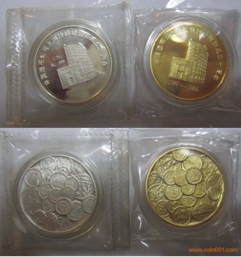 1995年制造,紫銅上色60mm,上幣發行。正面為上幣大樓,反面為5分、牡丹一元及熊貓疊幣圖。此章有仿品。