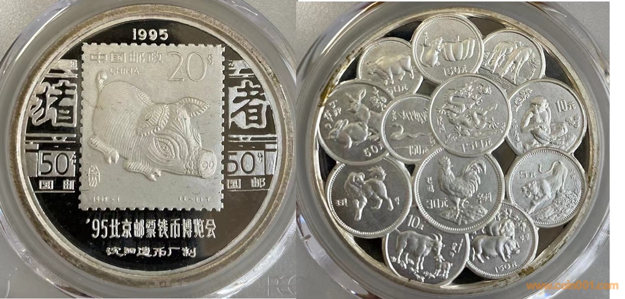 1995年制造,鍍銀精制40mm,沈幣發行。正面為豬年郵票,反面為金銀幣疊幣圖。
